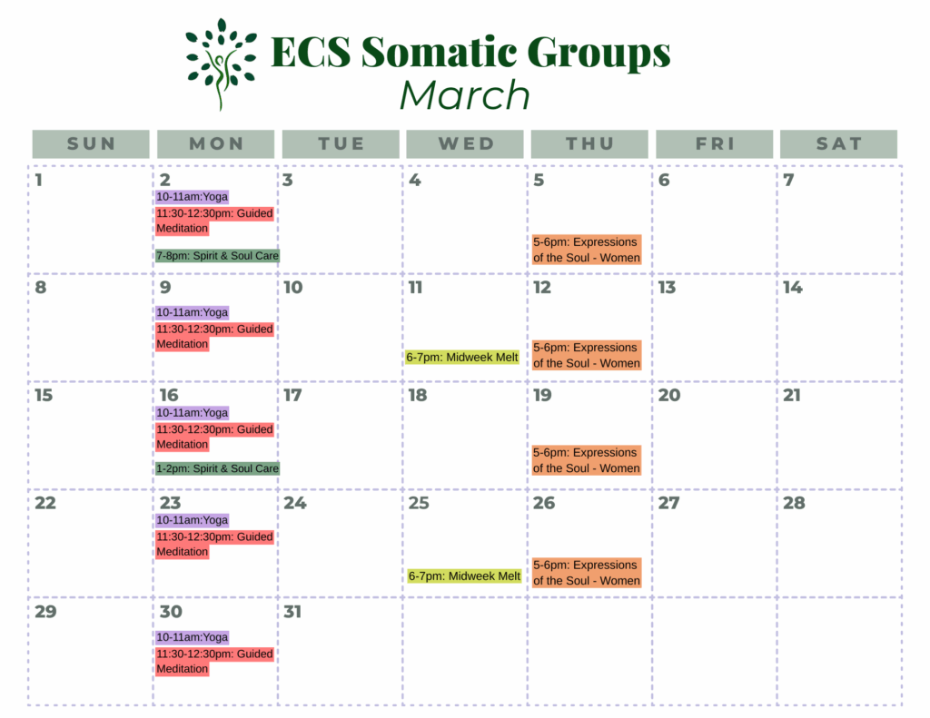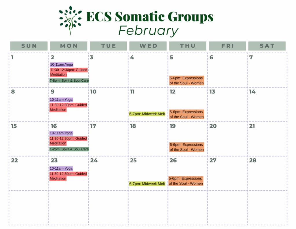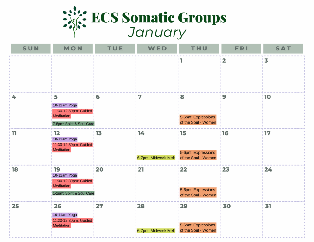 View the monthly calendars below to find a somatic group that fits your schedule and see the group descriptions below. *Somatic Groups are on break for December, but will be back in January.