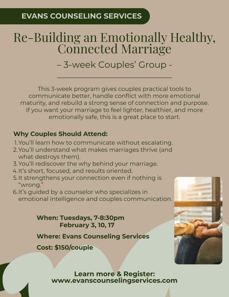 This 3-week program gives couples practical tools to communicate better, handle conflict with more emotional maturity, and rebuild a strong sense of connection and purpose. If you want your marriage to feel lighter, healthier, and more emotionally safe, this is a great place to start.