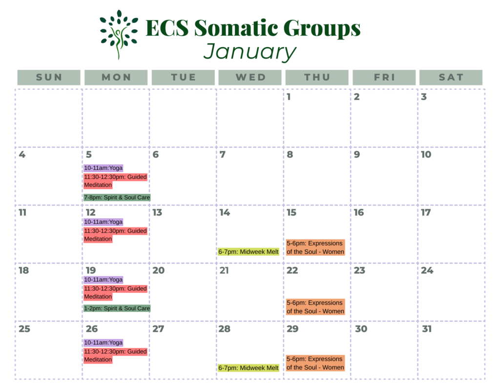 View the monthly calendars below to find a somatic group that fits your schedule and see the group descriptions below. *Somatic Groups are on break for December, but will be back in January.